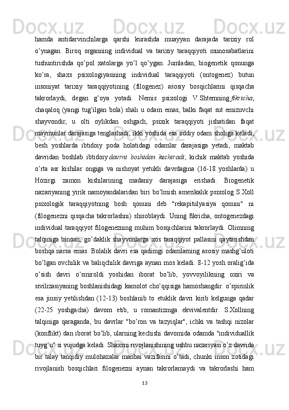 Shuningdek,   turli   yosh   davrlarining   o‘ziga   xos   rivojlanish   qonuniyatlari   ham