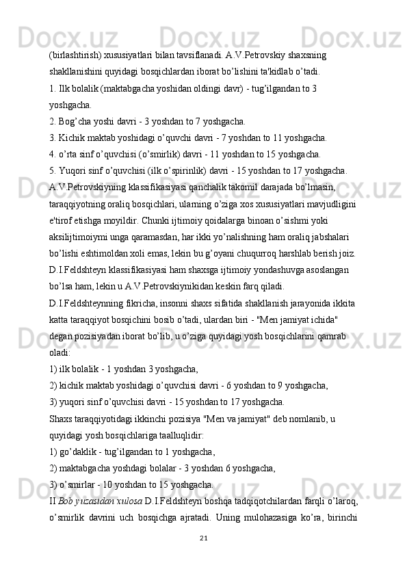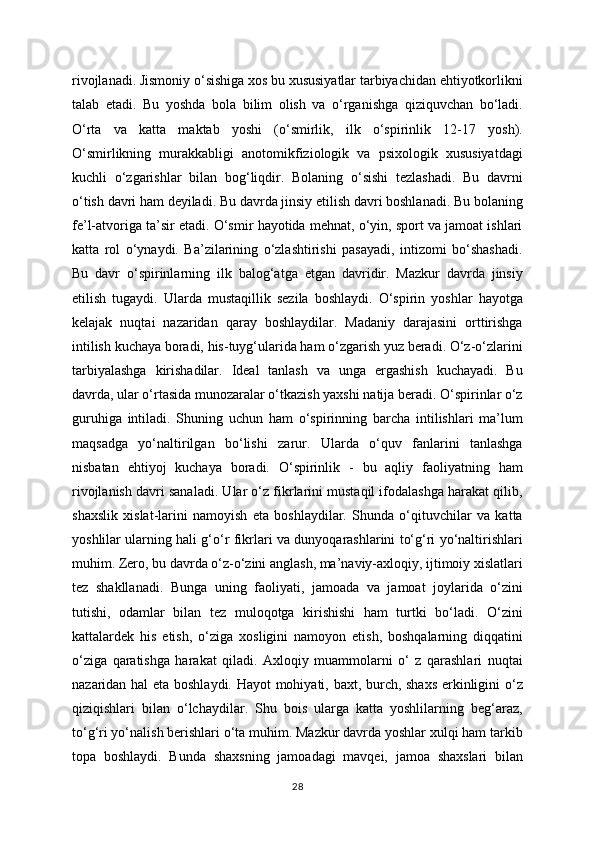 etilish   tugaydi.   Ularda   mustaqillik   sezila   boshlaydi.   O‘spirin   yoshlar   hayotga