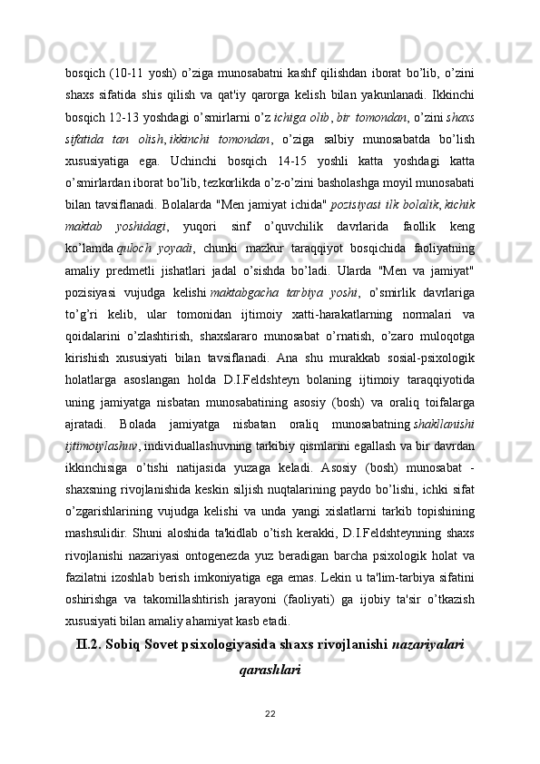 muhim. Zero, bu davrda o‘z-o‘zini anglash, ma’naviy-axloqiy, ijtimoiy xislatlari