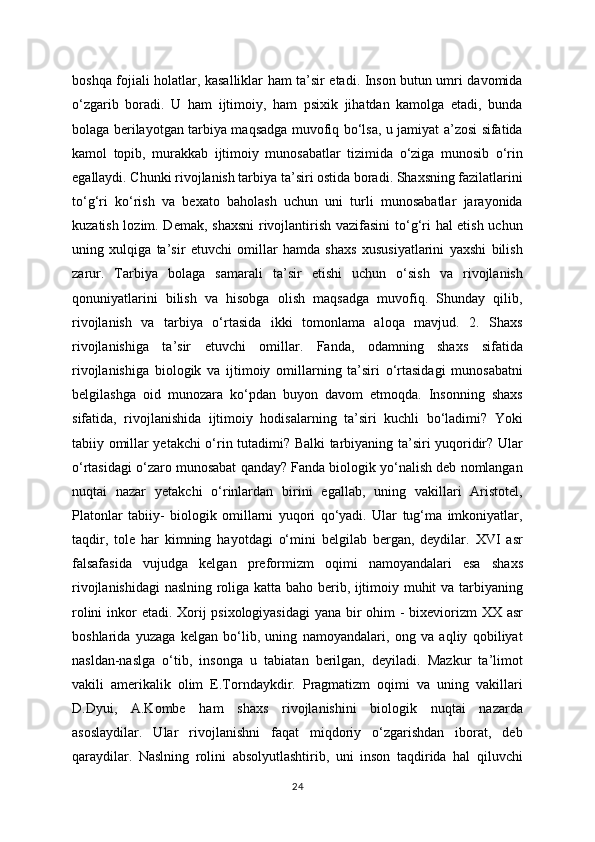 rivojlanish   bir-biriga   ta’sir   etadi,   bu   tarbiya   doimiy   va   uzluksizdir.   Shunday