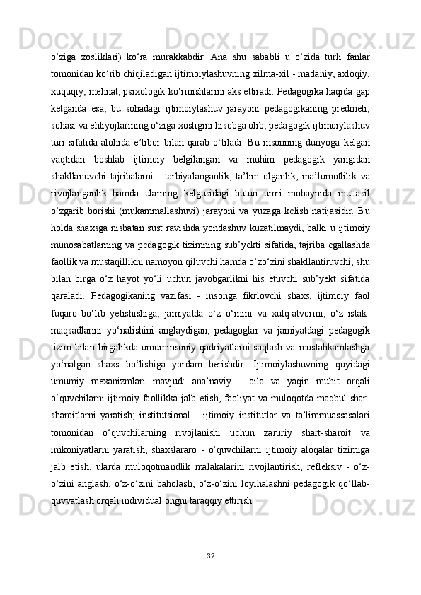 ketganda   esa,   bu   sohadagi   ijtimoiylashuv   jarayoni   pedagogikaning   predmeti,