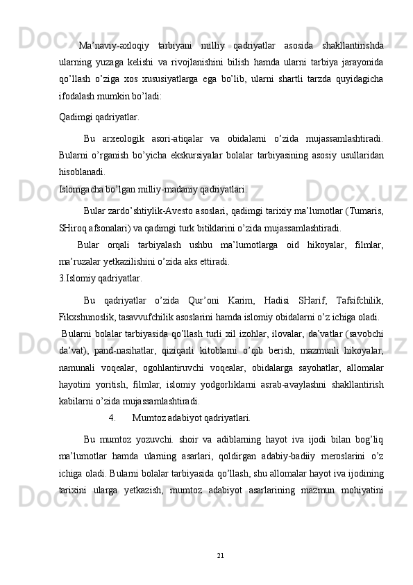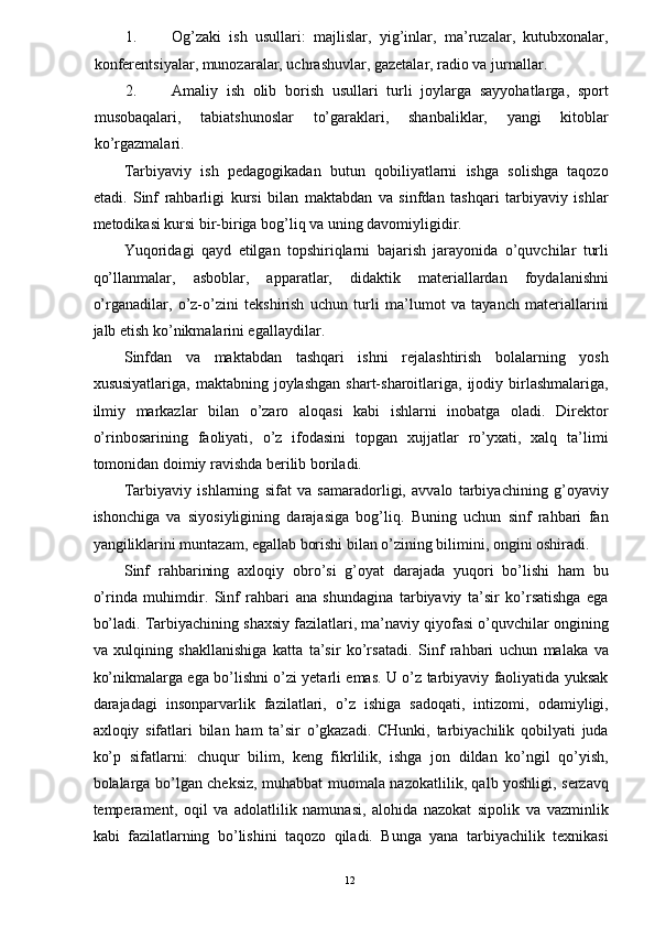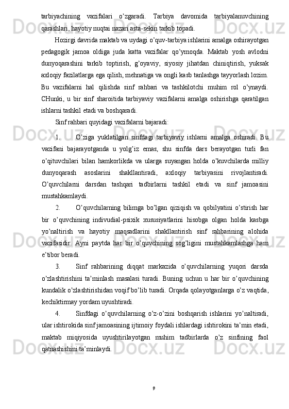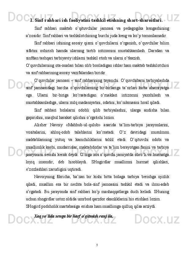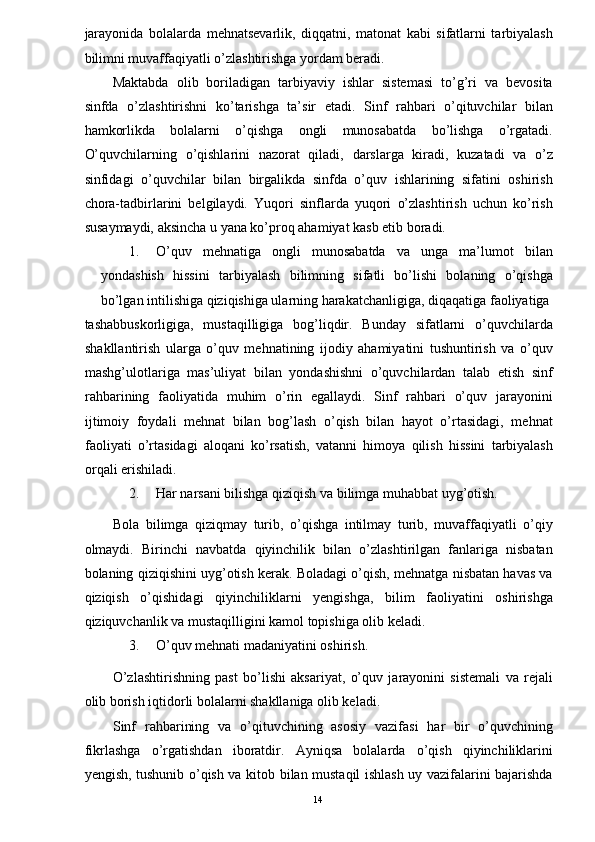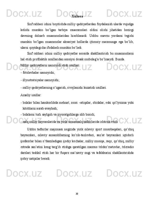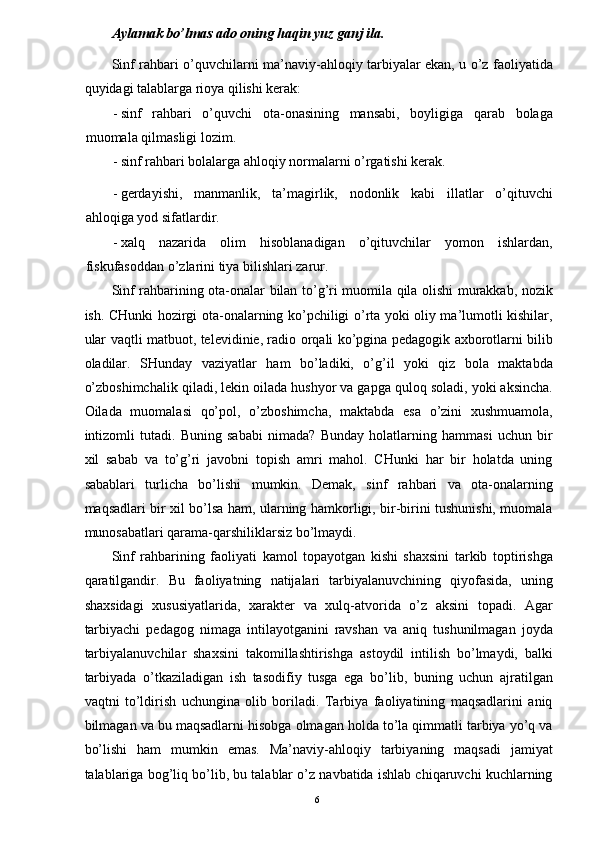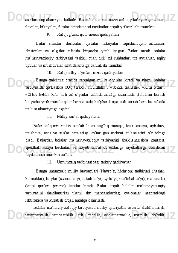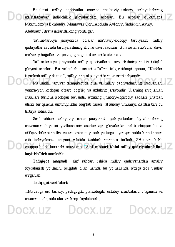 Sinf rahbari ishini milliy qadriyatlar bilan boyitish