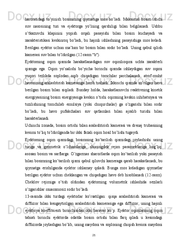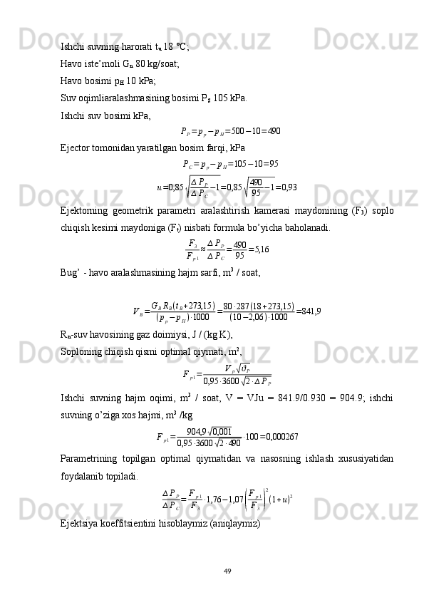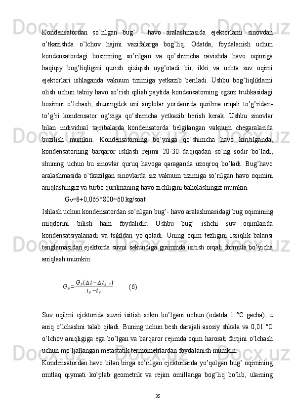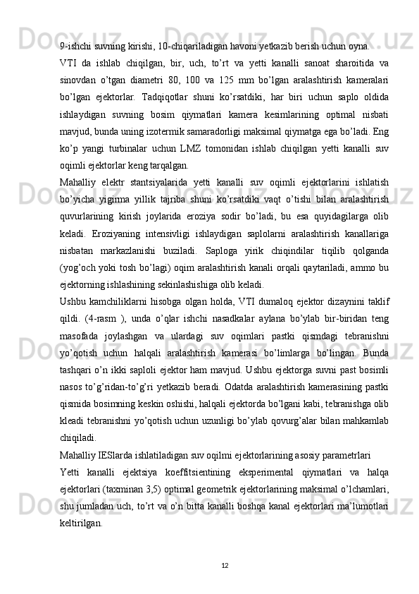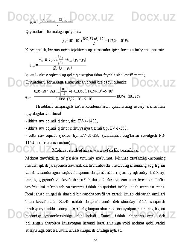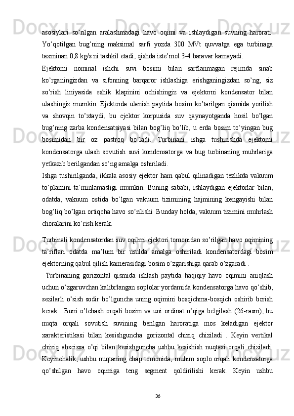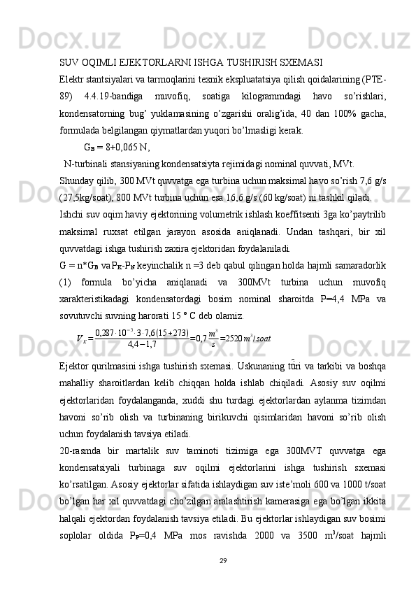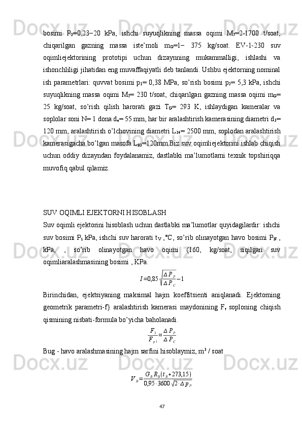 SIRDARYO IES da 300mw li bug' turbina qurilmasi kondensatorida kondensatsiyalanmaydigan bug'-havo aralashmasini olib tashlovchi suv oqimli ejektorlarning hisobi