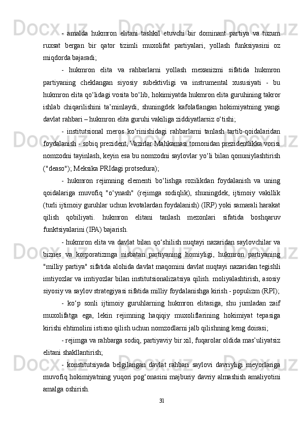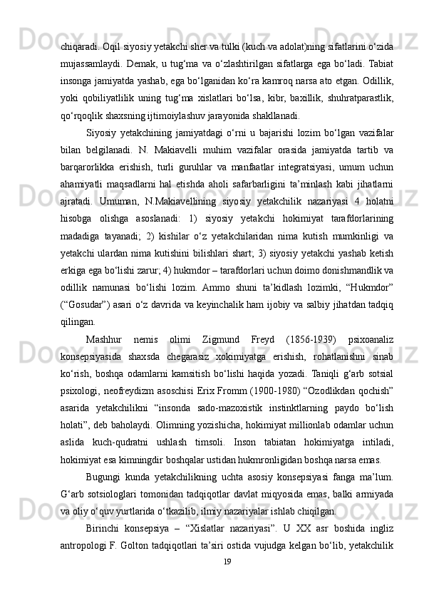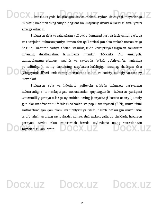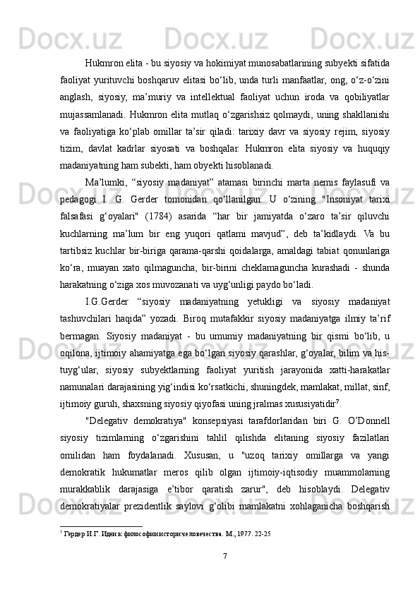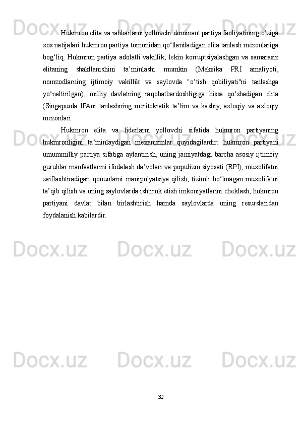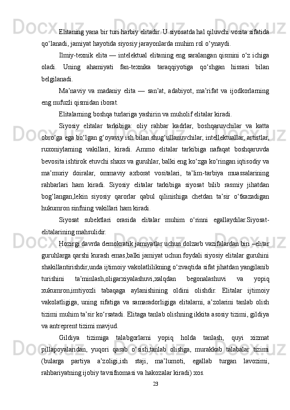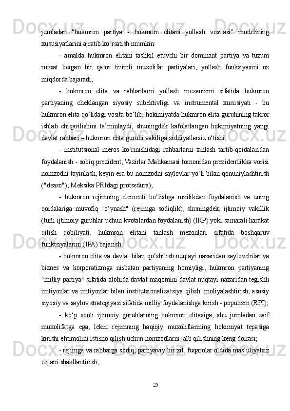 | 2.1 Siyosiy elita turlari va uning o’ziga xos xususiyatlari | 21-24 | |