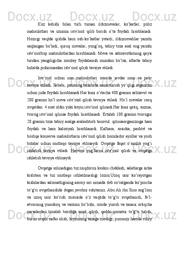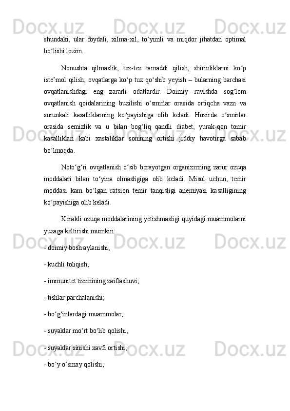 II BOB. OVQATLANISH RATSIONI VA UNI BUZISH OQIBATLARINING SALBIY TOMONLARI.