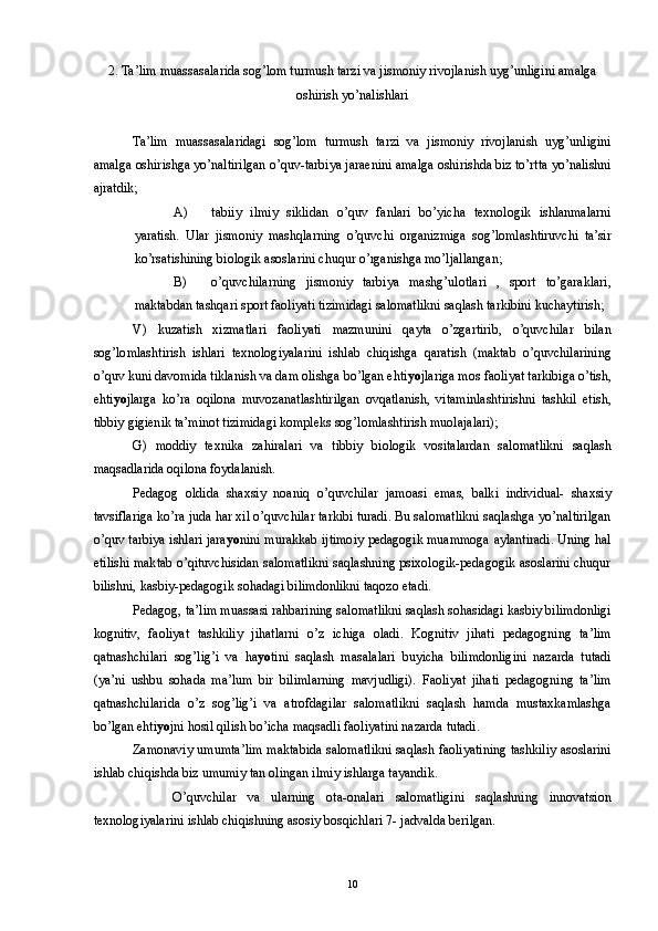 6) salomatlikni   saqlashga   yo’naltirilgan   jismoniy   mashqlarni   olib   borish