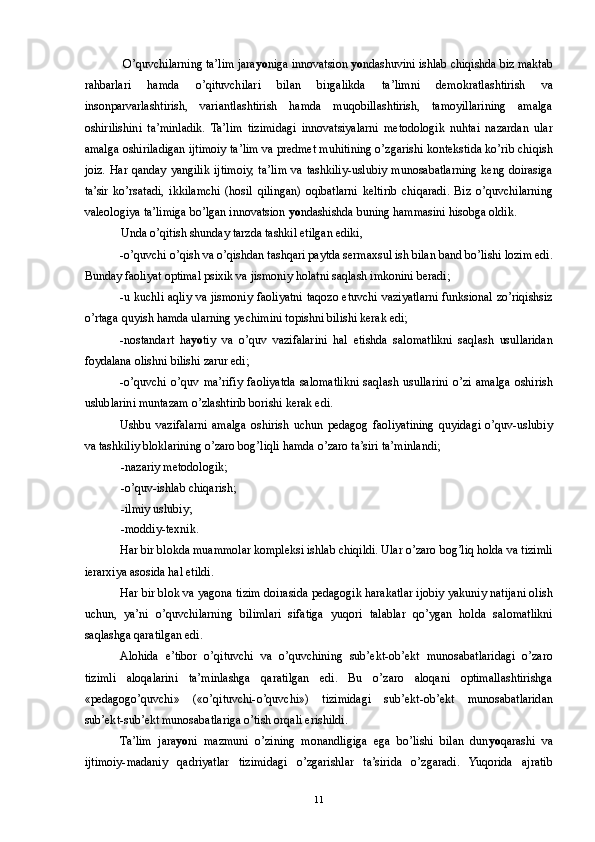 chiqishga bo’lgan ijodiy munosabat yuksak darajadagi kasbiy pedagogik tay yo rlikka ega maktab