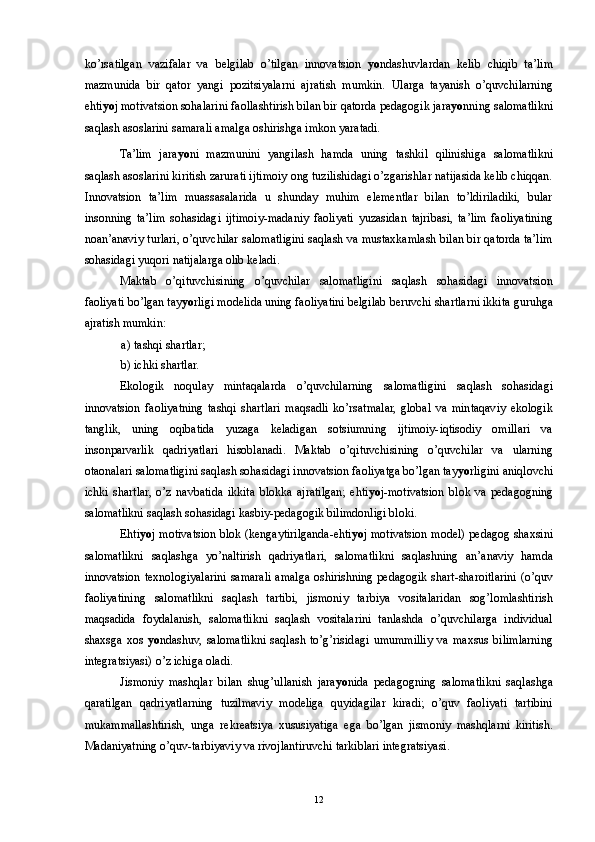 modelini   loyihalash,   shuningdek,   o’qituvchining   sog’lomlashtirish   faoliyatiga   bo’lgan