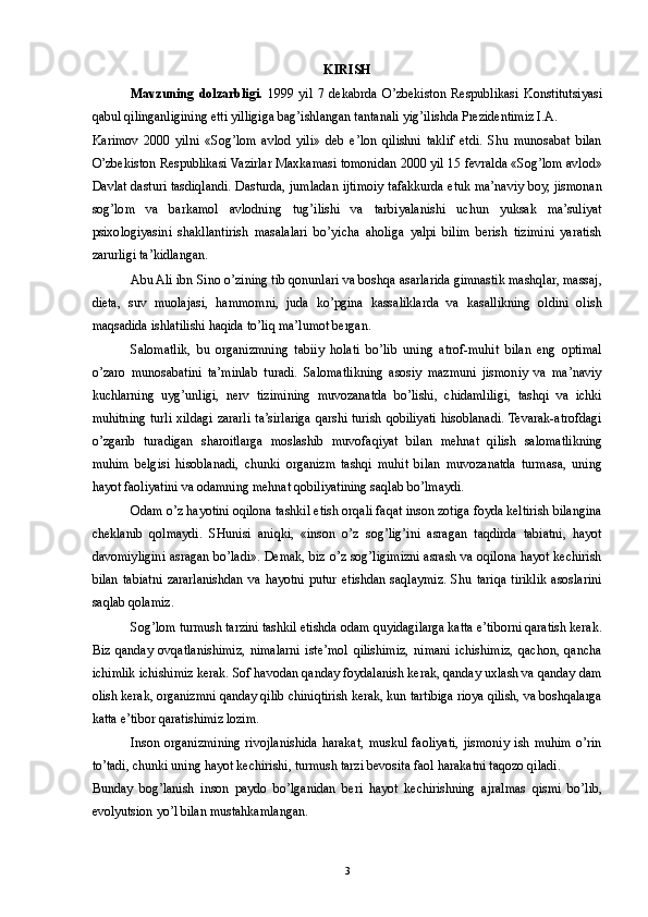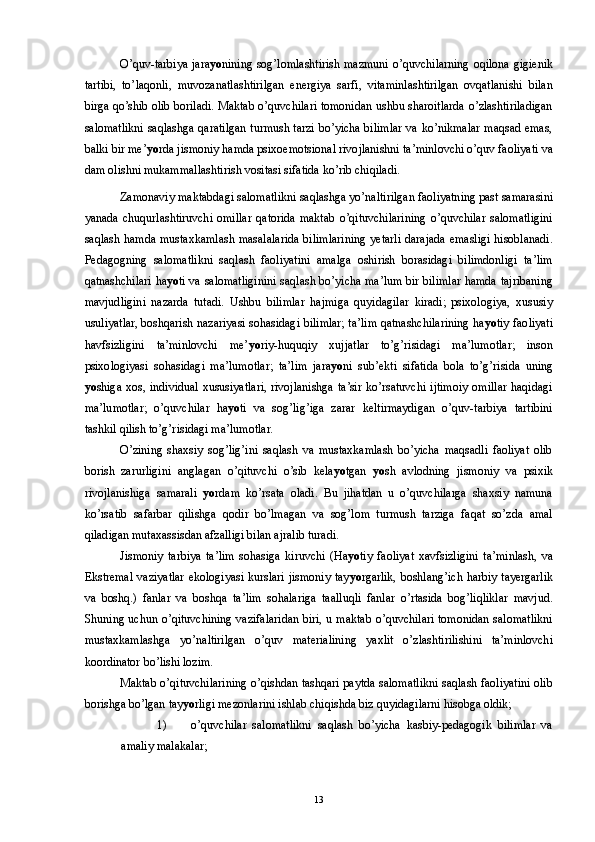 o’rganar   ekanmiz,   unda   har   bir   shaxsning   o’z   salomatligini   saqlashga   to’g’ri   va   mas’uliyatli