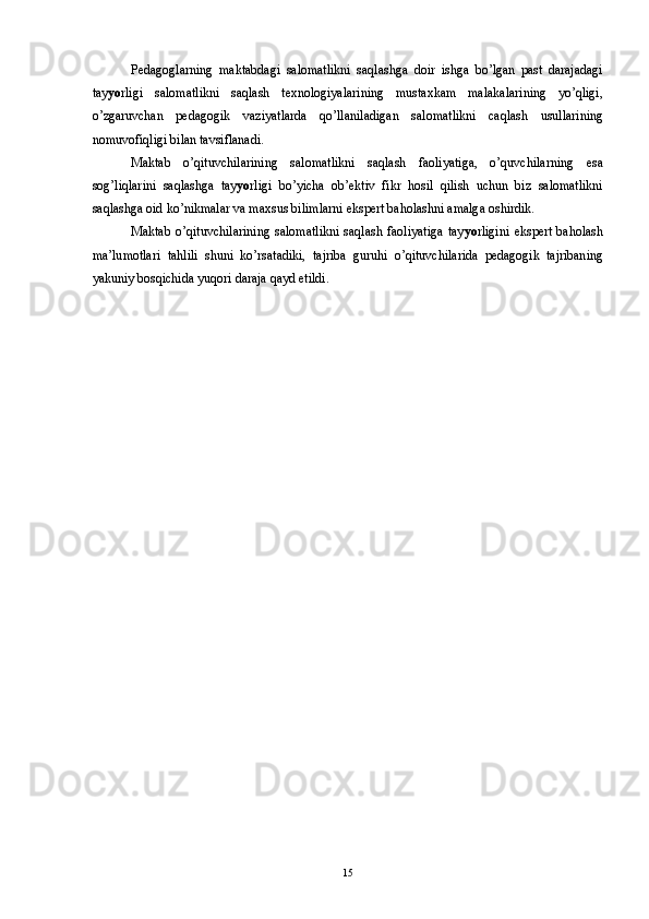 Maktab   o’qituvchilarining   salomatlikni   saqlash   faoliyatiga   tay yo rligini   ekspert   baholash