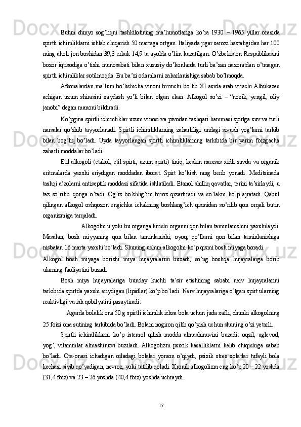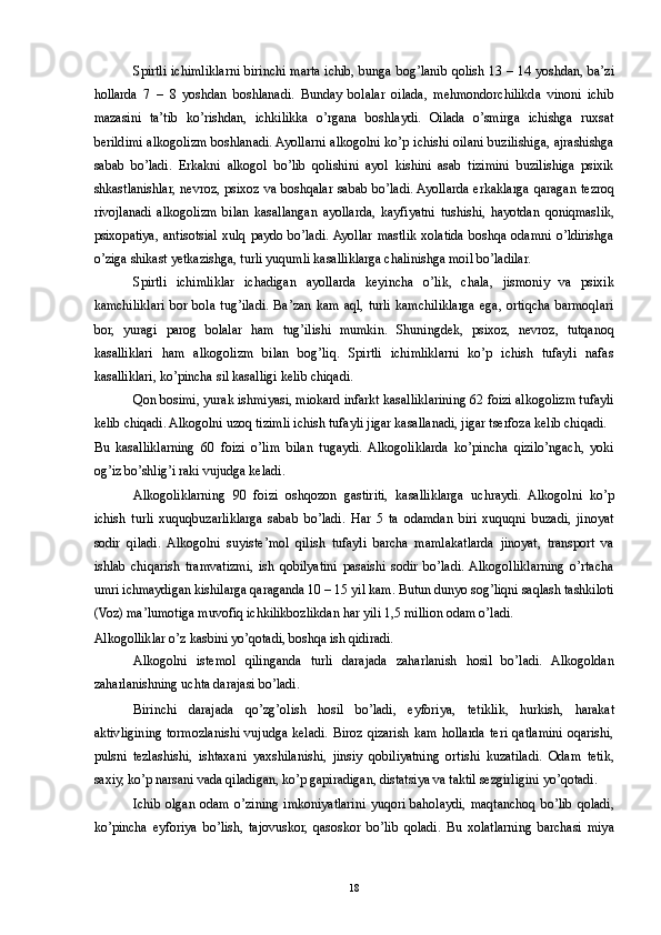 a’zolari   buziladi.  Alkogolizmdan   odam   vahliroq   o’ladi.   Alkogolizmni   ozgina   ichilganda   ham