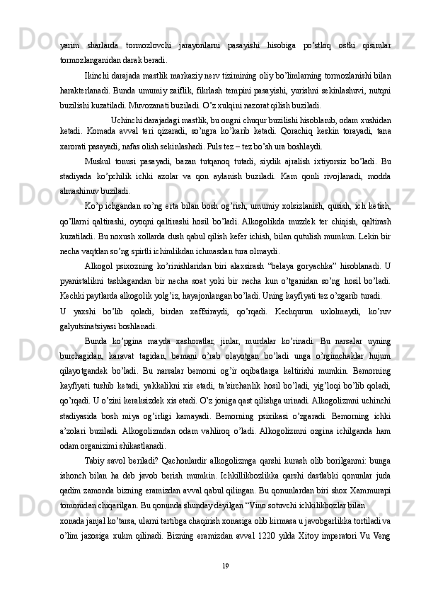 Ikinchi darajada mastlik markaziy nerv tizimining oliy bo’limlarning tormozlanishi bilan