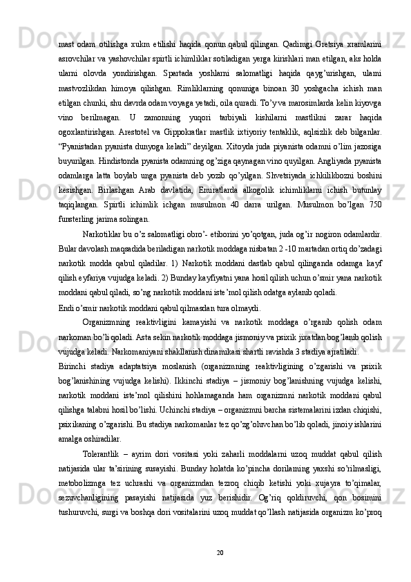 moddani qabul qiladi, so’ng narkotik moddani iste’mol qilish odatga aylanib qoladi.