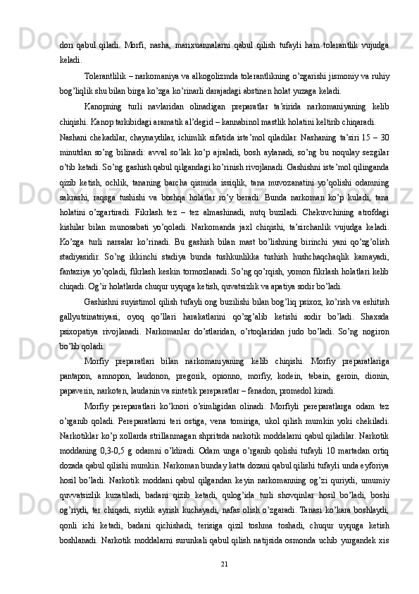 4 dori   qabul   qiladi.   Morfi,   nasha,   marixuannalarni   qabul   qilish   tufayli   ham   tolerantlik   vujudga