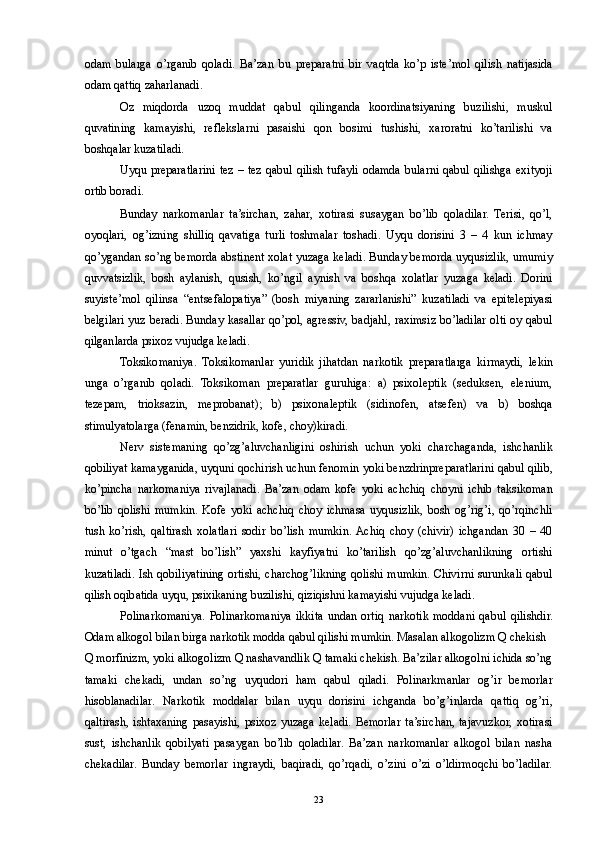 Bular davolash maqsadida beriladigan narkotik moddaga nisbatan 2 -10 martadan ortiq do’zadagi
