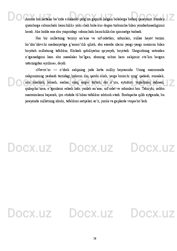 Bugungi   kunda   yoshlarimizni   boy   madaniy   merosimiz,   tarixiy   an’analarimizga,   milliy