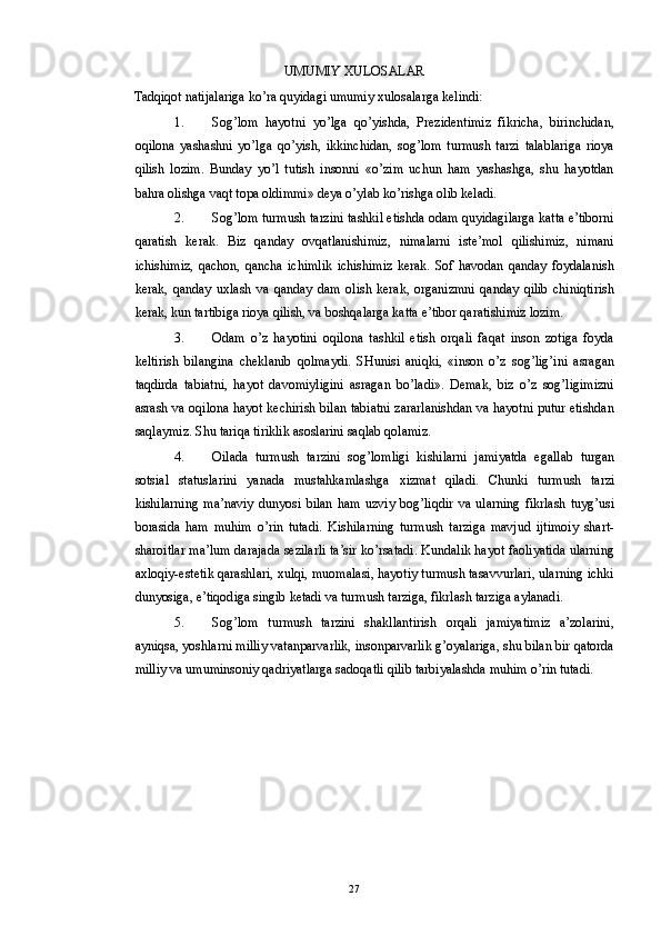 munosabatda bo’lishi, sog’lom turmush tarzini eng avvalo o’zi, qolaversa yaqinlari uchun tashkil