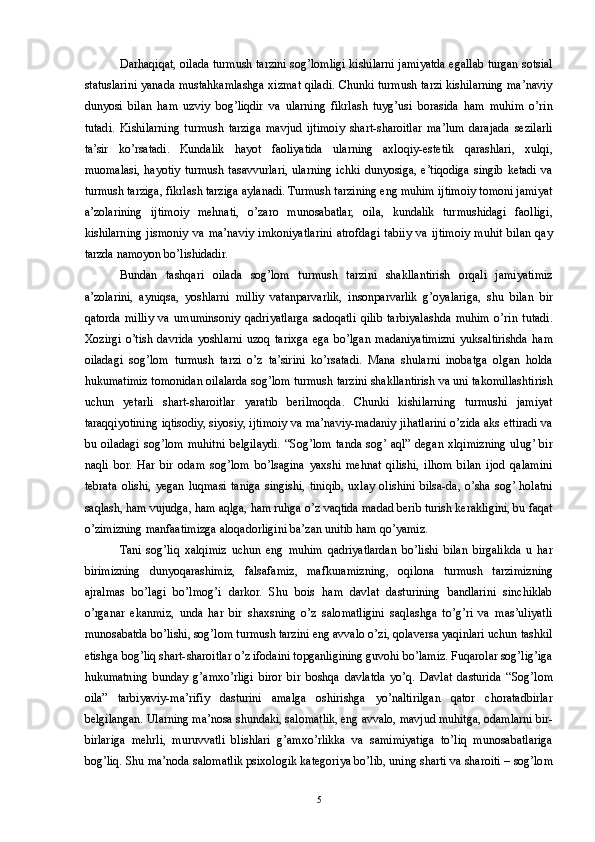 20 Darhaqiqat, oilada turmush tarzini sog’lomligi kishilarni jamiyatda egallab turgan sotsial
