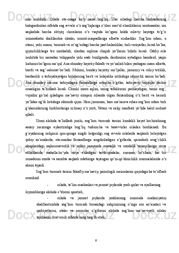 bu   oiladagi   sog’lom   muhitni   belgilaydi.   “Sog’lom   tanda   sog’  aql”   degan   xlqimizning   ulug’  bir