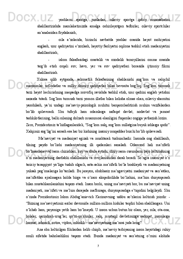 hukumatimiz tomonidan oilalarda sog’lom turmush tarzini shakllantirish va uni takomillashtirish