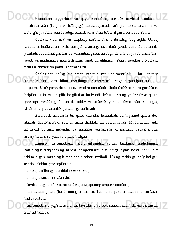 uchun barcha to‘plangan anketalar yoki intervyu shakllari tekshirilishi, kodlanishi,