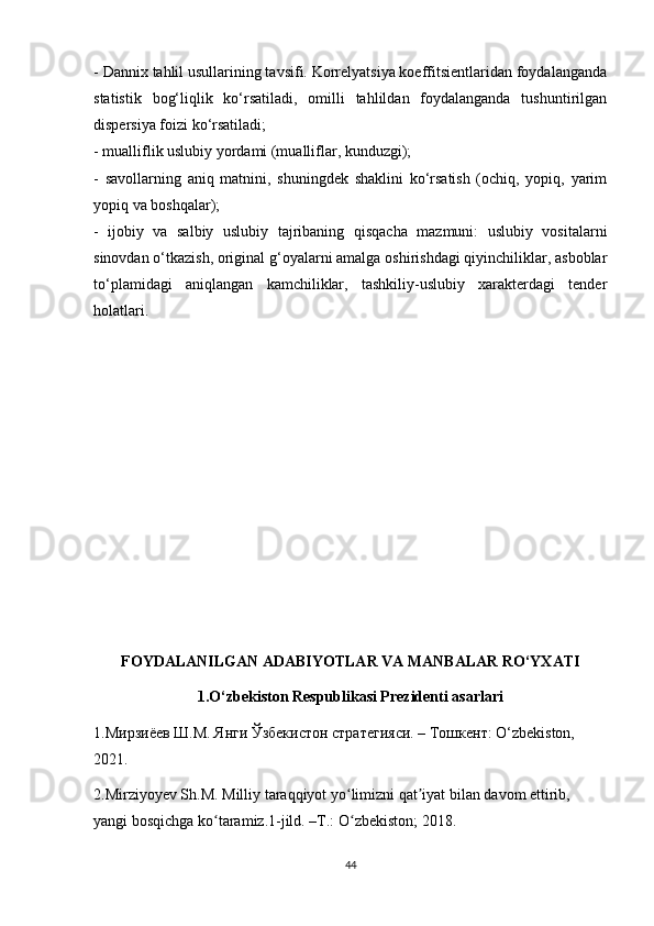 19 - Dannix tahlil usullarining tavsifi. Korrelyatsiya koeffitsientlaridan foydalanganda