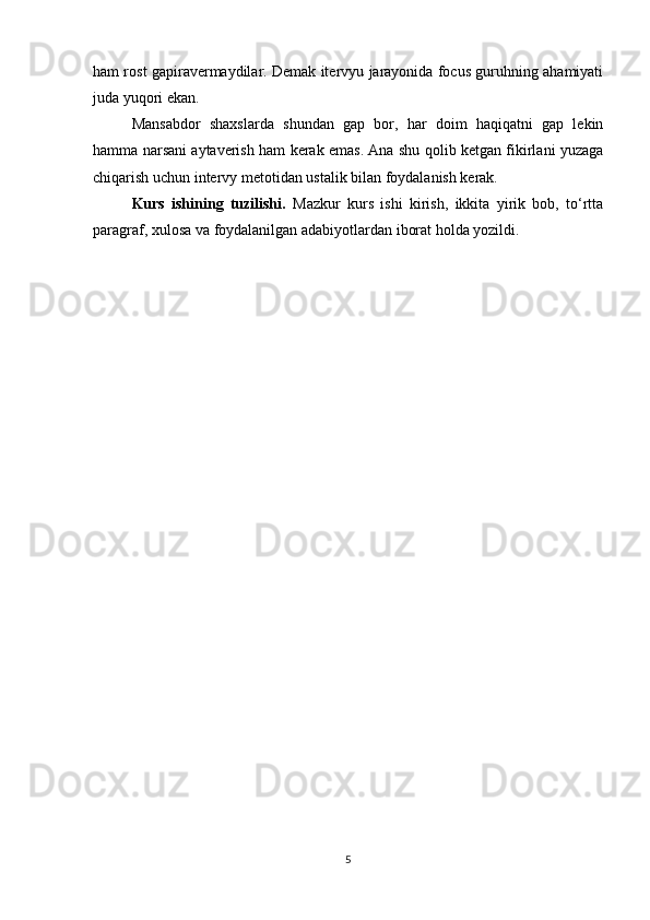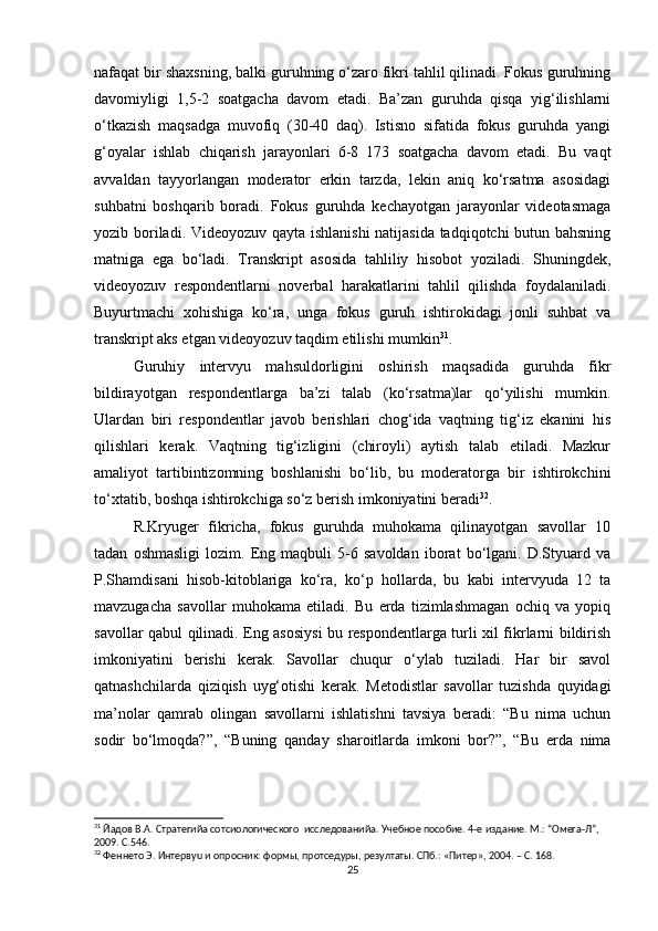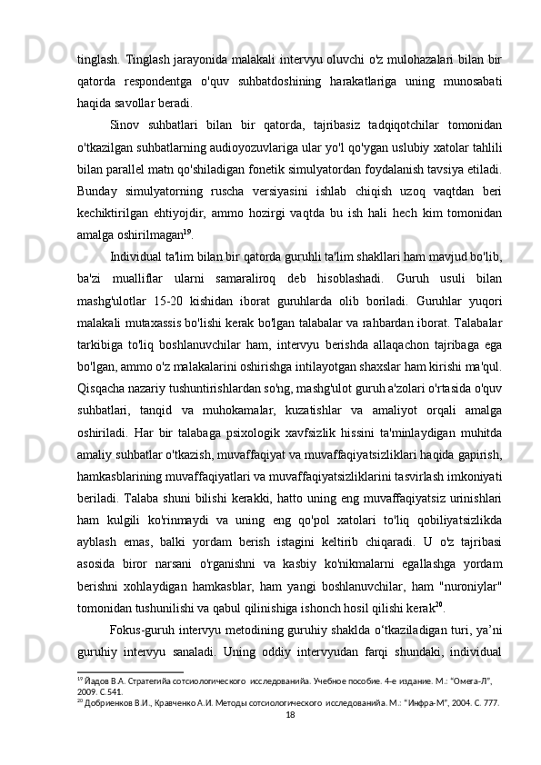 20 tinglash. Tinglash jarayonida malakali intervyu oluvchi o'z mulohazalari bilan bir