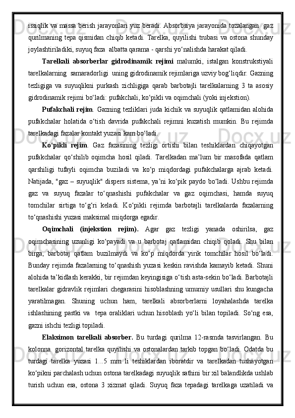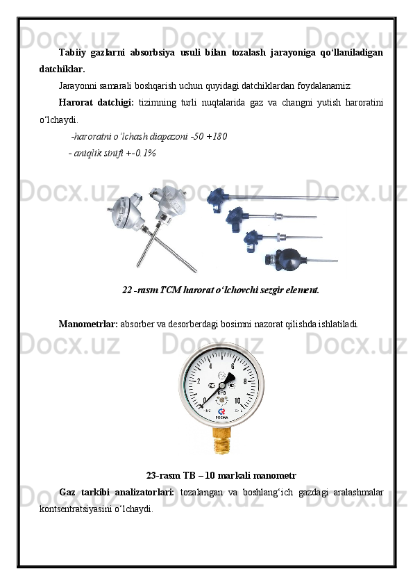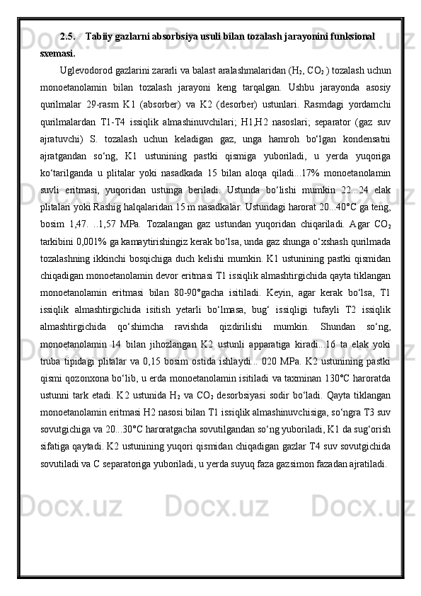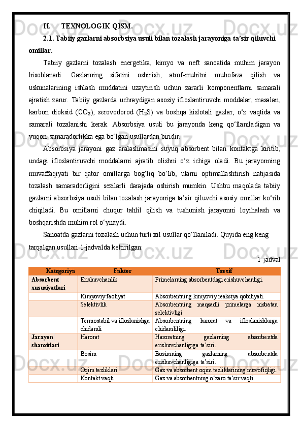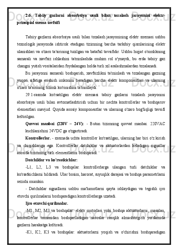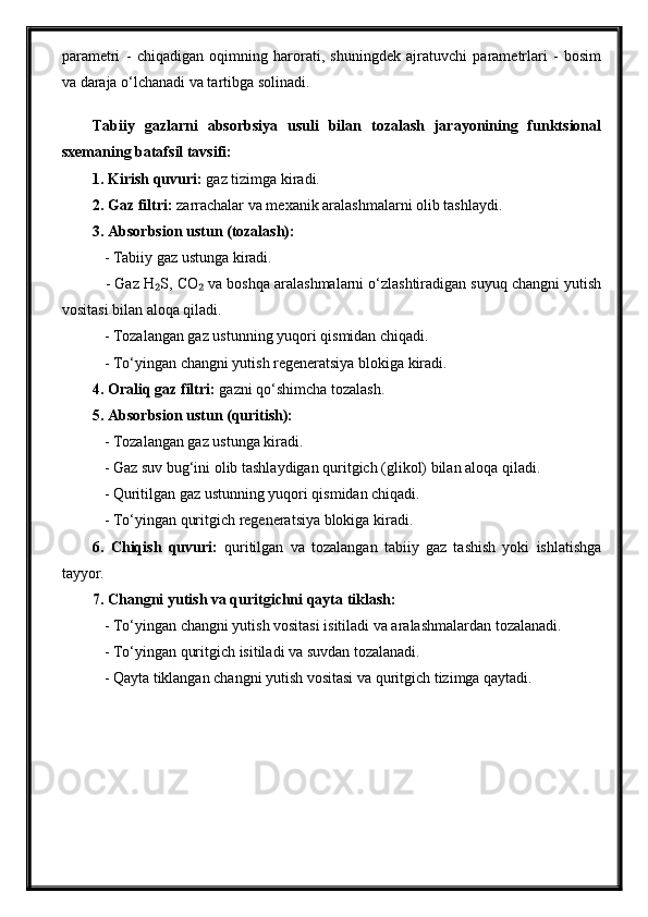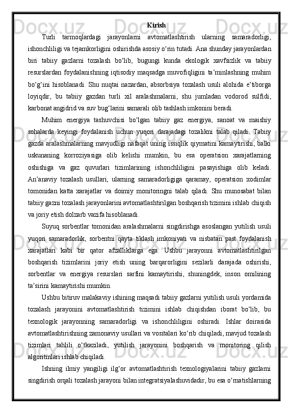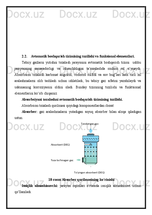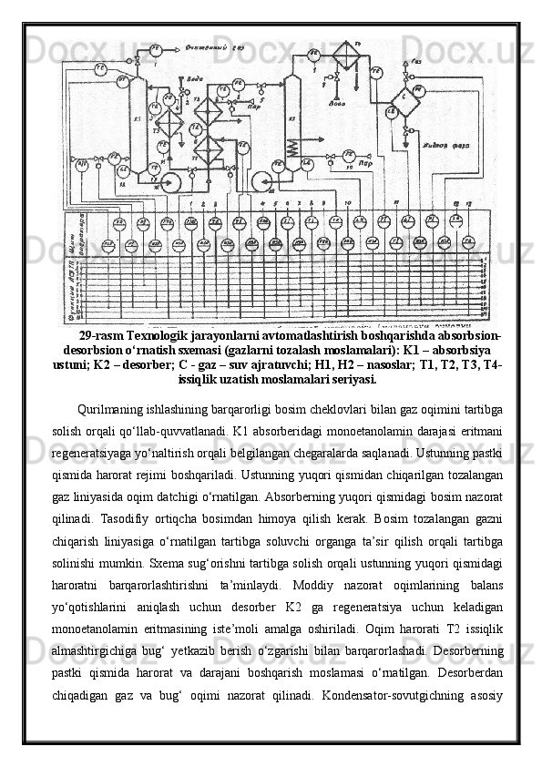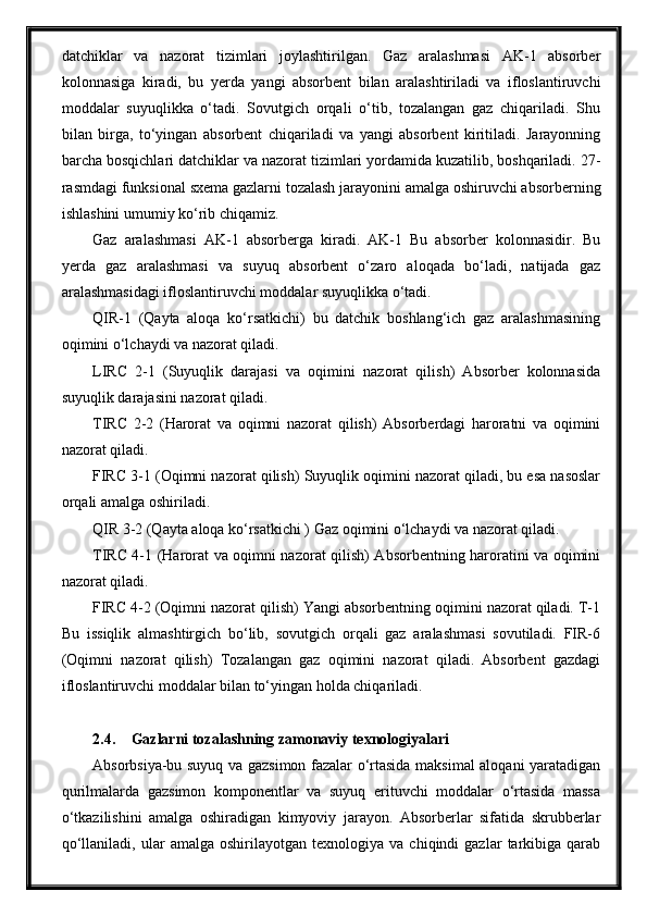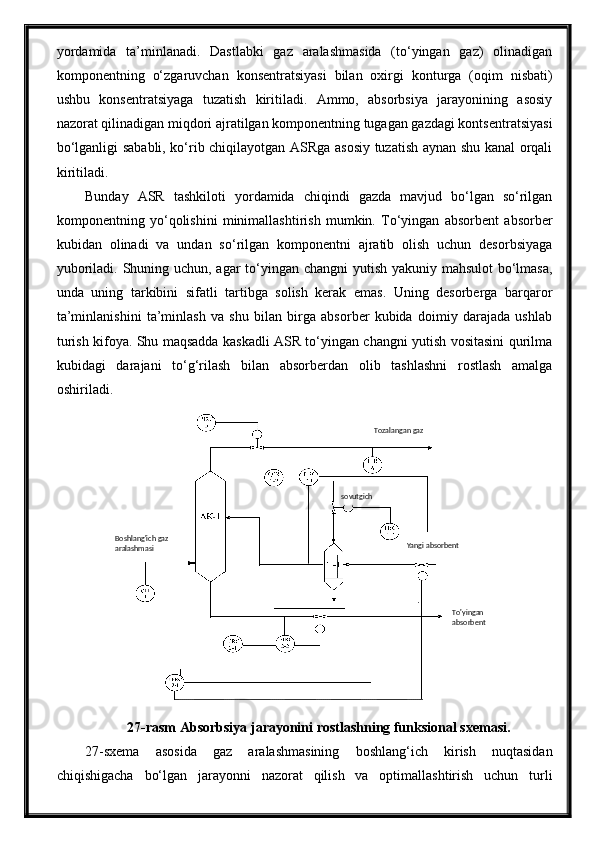 Tabiiy gazlarni absorbsiya usuli bilan tozalash jarayonini avtomatlashtirish