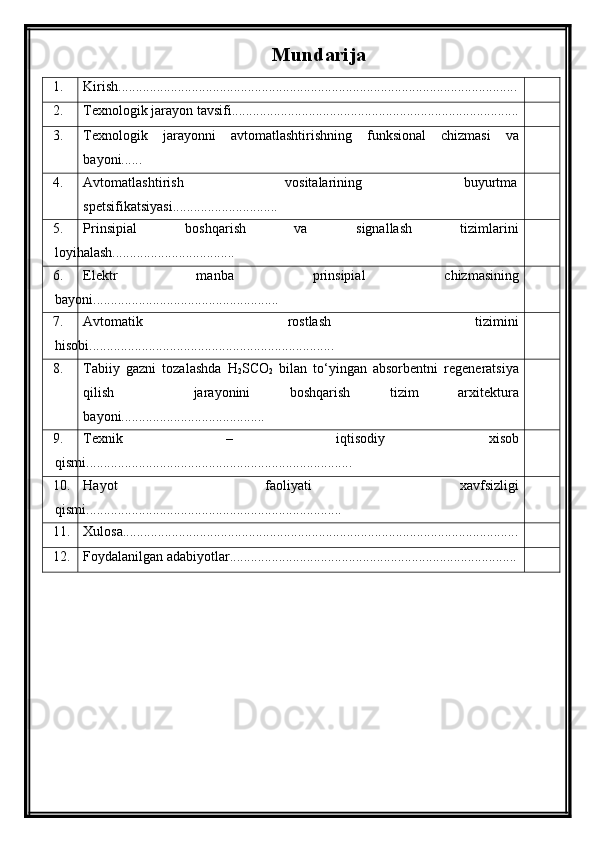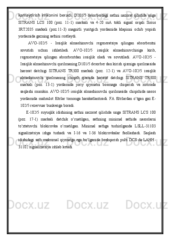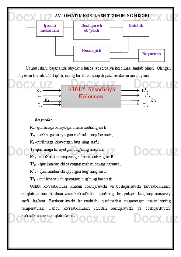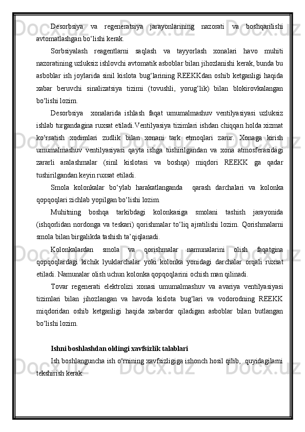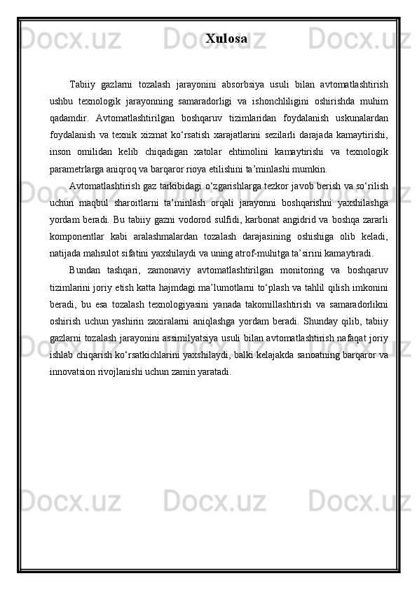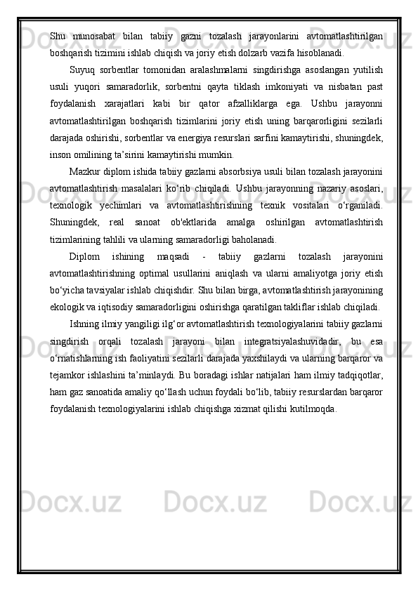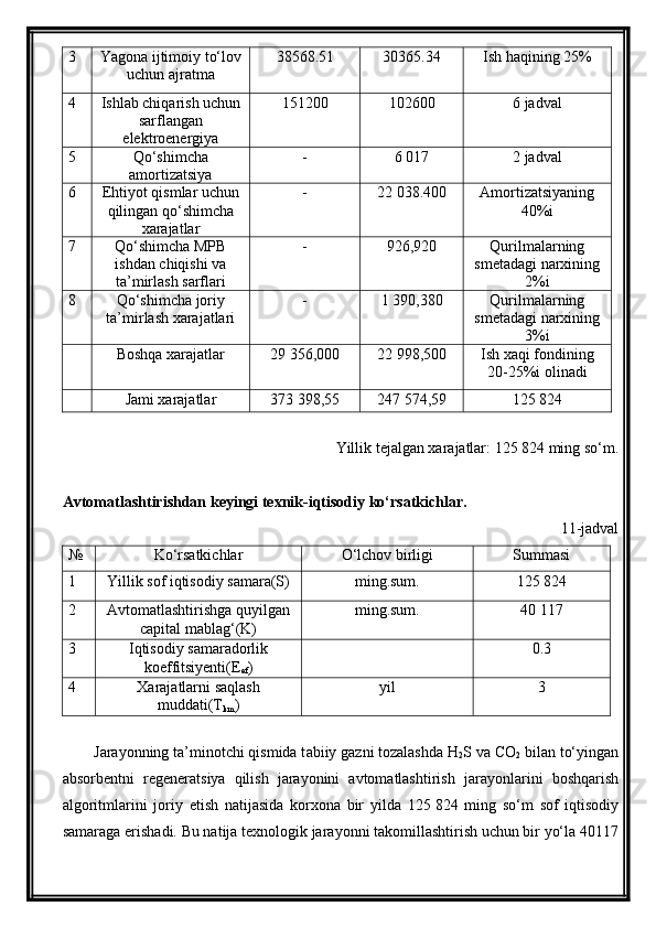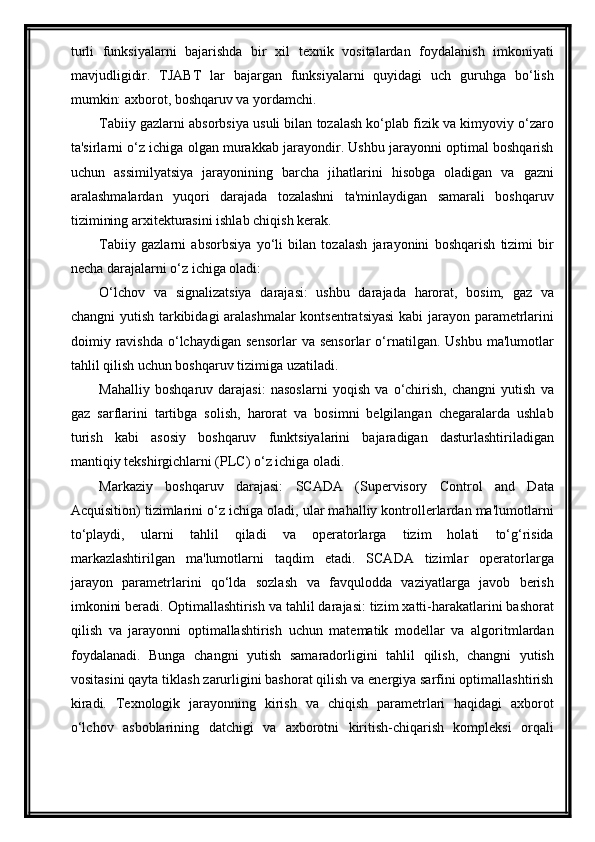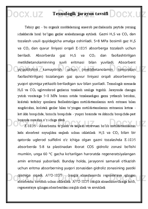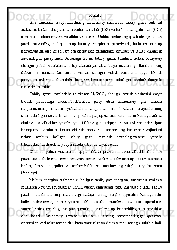 Tabiiy gazni tozalashda H2SCO2 bilan to'yingan absorbentni regeneratsiya qilish jarayonini avtomatlashtirish