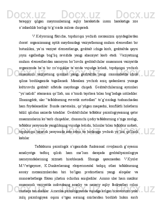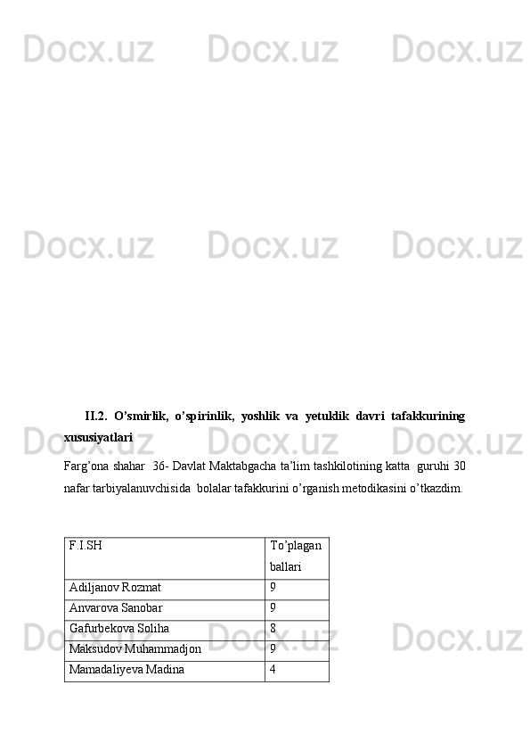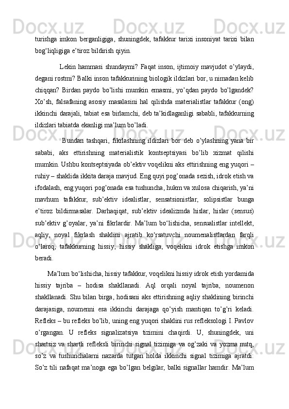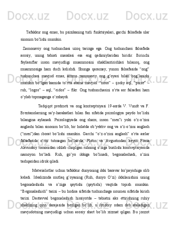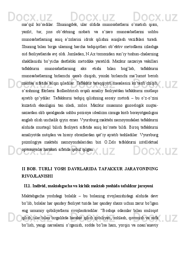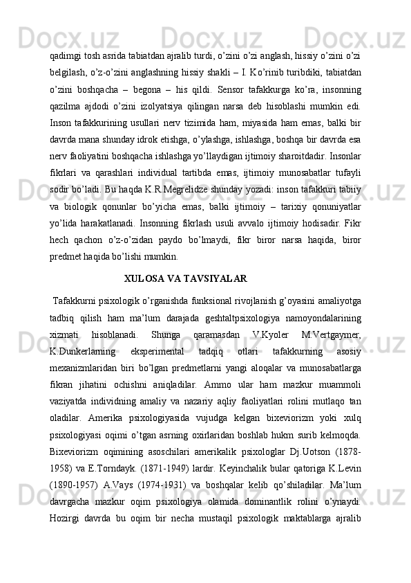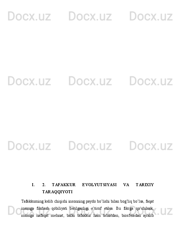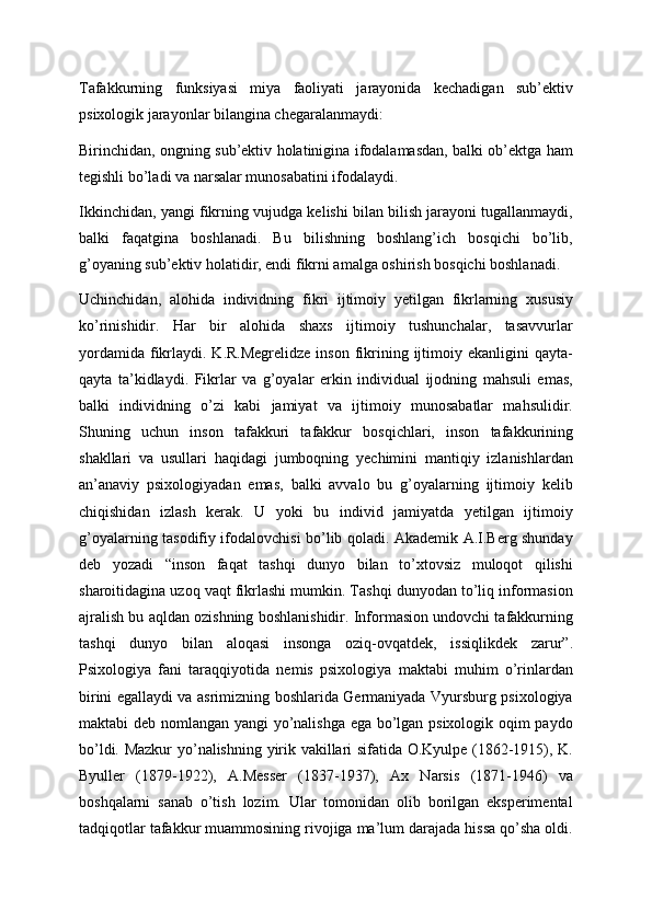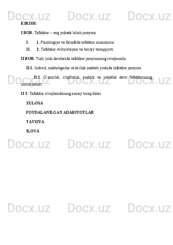 Psixologiya va falsafada tafakkur muammosi, Tafakkur evolyutsiyasi va tarixiy taraqqiyoti, Turli yosh davrlarida tafakkur jarayonining rivojlanishi , Individ, maktabgacha va kichik maktab yoshida tafakkur jarayoni, O’smirlik, o'spirinlik, yoshlik va yetuklik davri tafakkurining xususiyatlari, Tafakkur rivojlanishining asosiy bosqichlari.