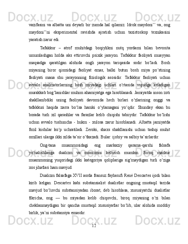 Dualizm   ong   va   materiya   (yoki   tana)   orasidagi   munosabatlarni