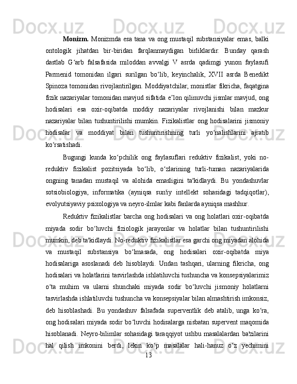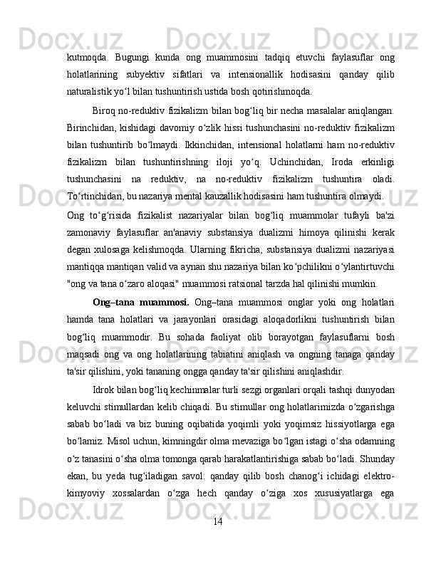 nomoddiy   substansiya   sifatida   ko riluvchi   ong   va   onglilik   tushunchalarini