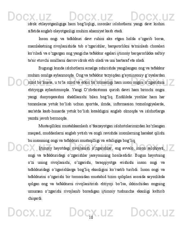 yakuniy xulosalarga keladi. Prezidemtimiz xalqimiz ongidagi chuqur o zgarishlarʻ
