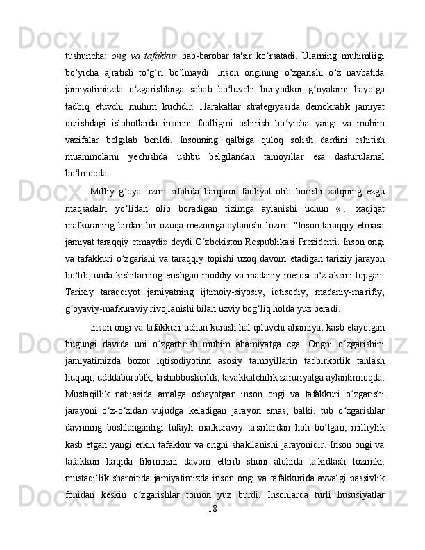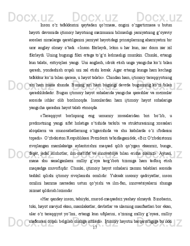 jamiyat taraqqiy etmaydi» deydi O zbekiston Respublikasi Prezidenti. Inson ongi