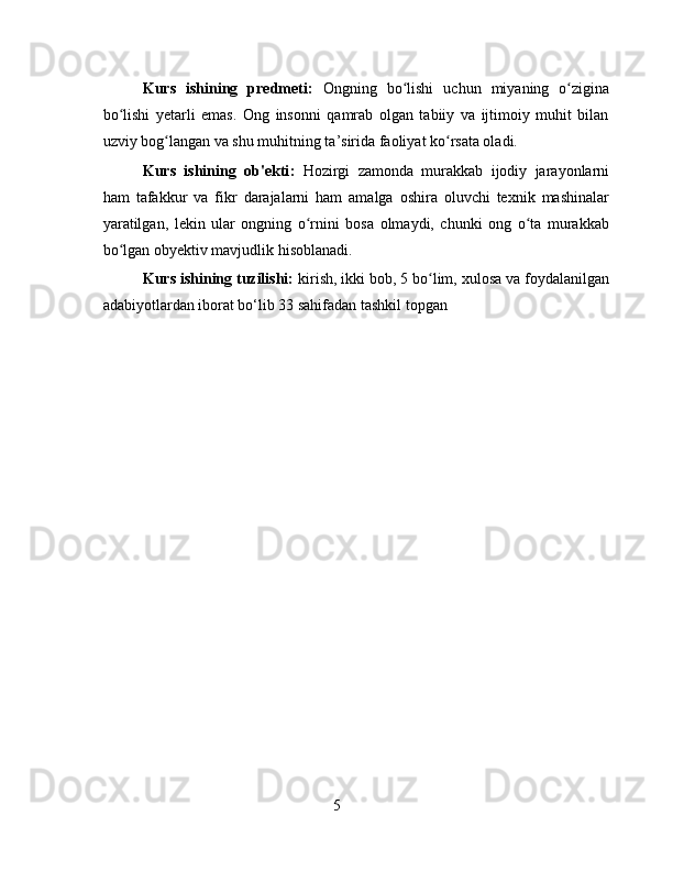 Kurs   ishi   mavzusining   dolzarbligi :   Insonlar   ong   haqida   fikrlar   ekan   uni