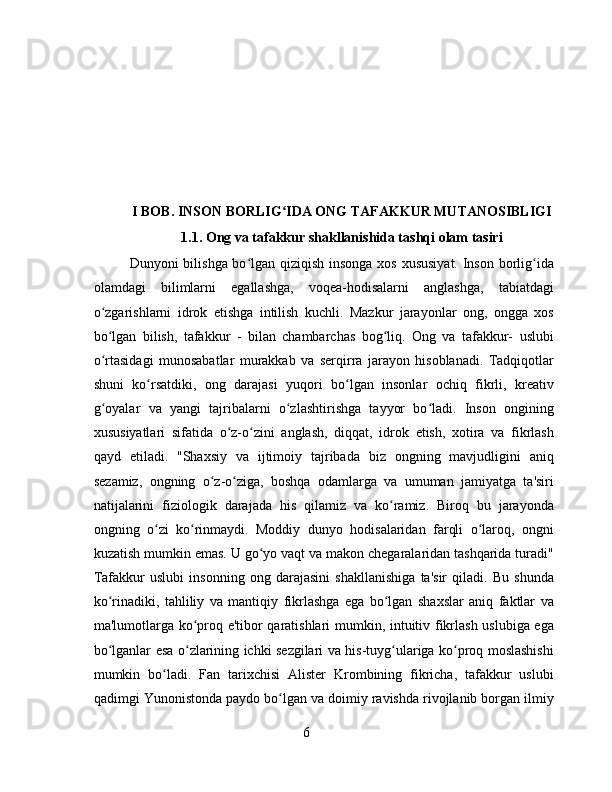 1 Kurs ishining birinchi bobida: Ong va tafakkur shakllanishida tashqi olam