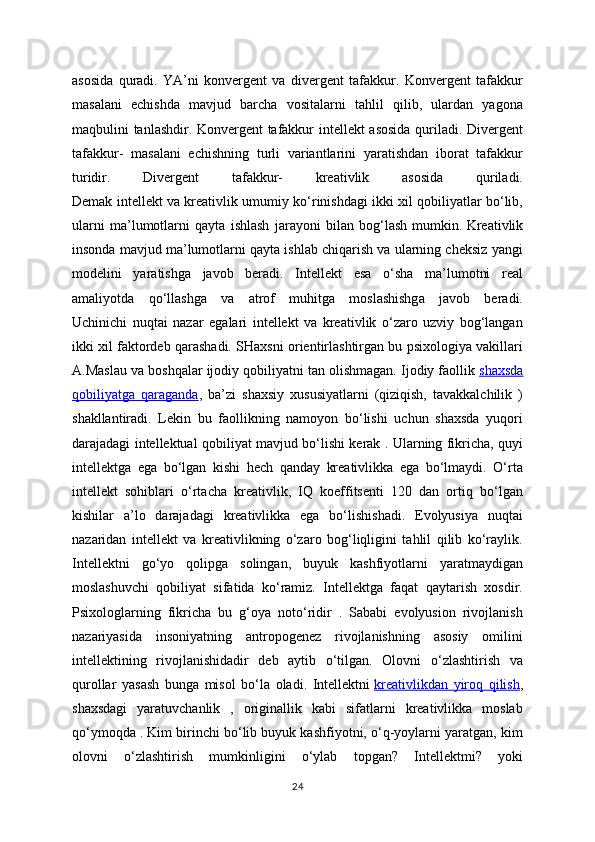 kreativlikni   oliy   darajadagi   insoniy   qobiliyatlarning   birligi   deb   bilishadi.