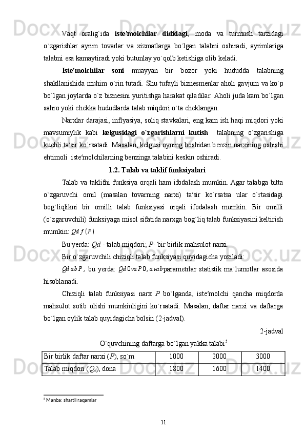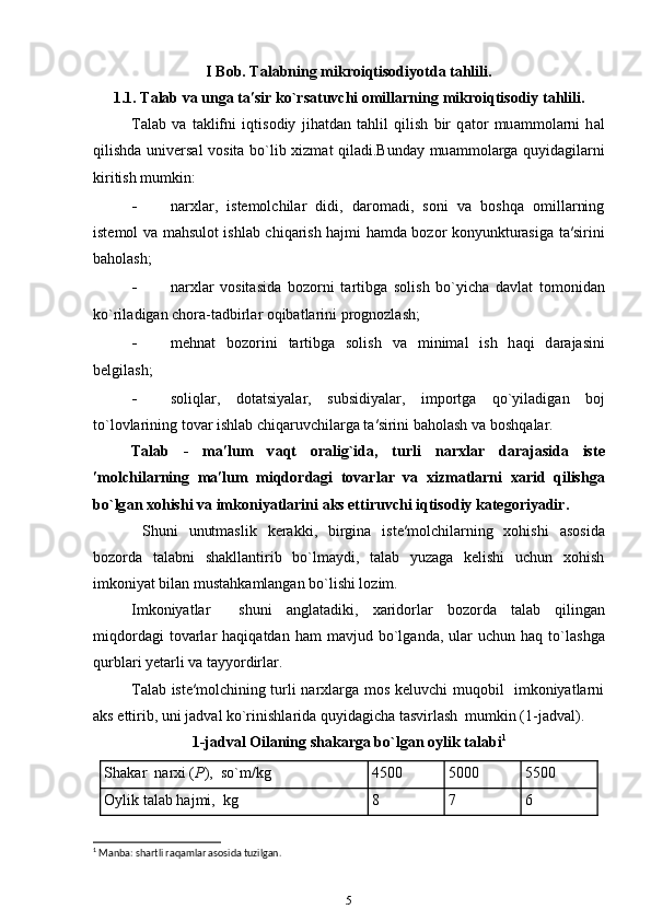 1.1. Talab va unga ta′sir ko`rsatuvchi omillarning mikroiqtisodiy tahlili. 4