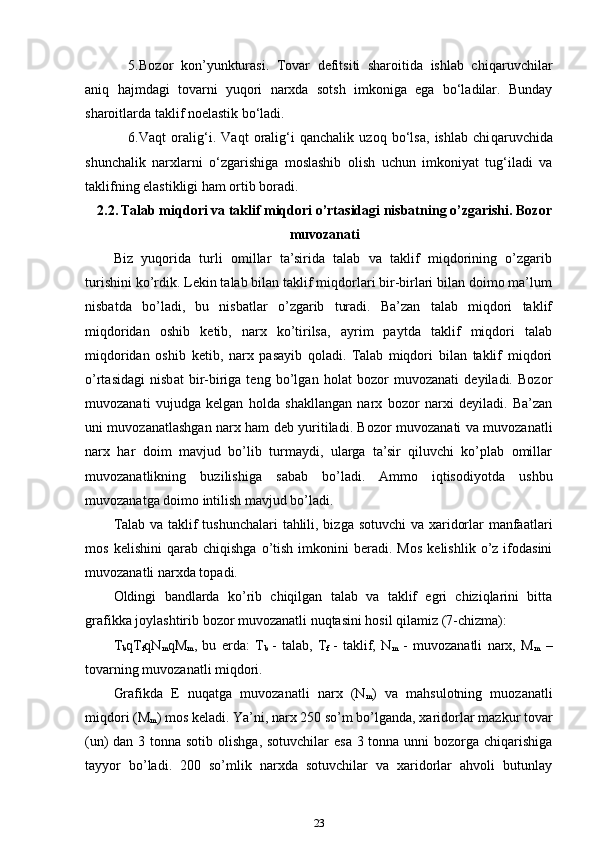2.2. Talab miqdori va taklif miqdori o’rtasidagi nisbatning o’zgarishi. Bozor muvozanati 21