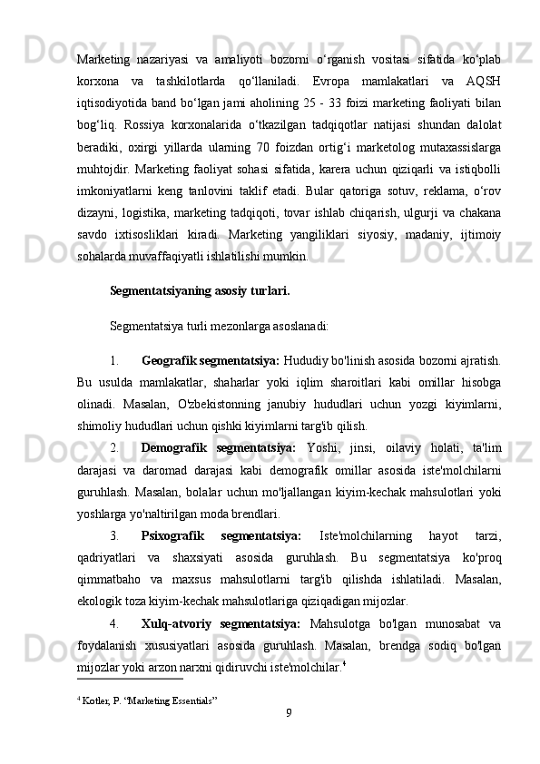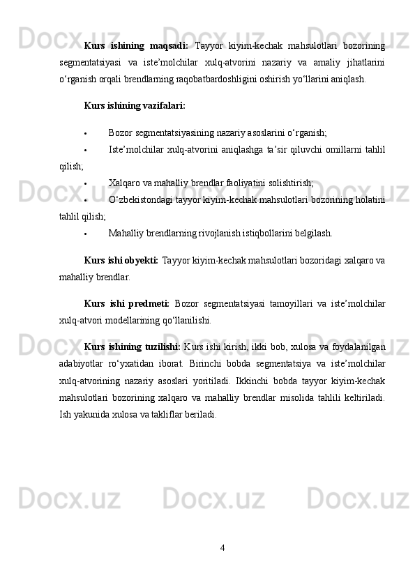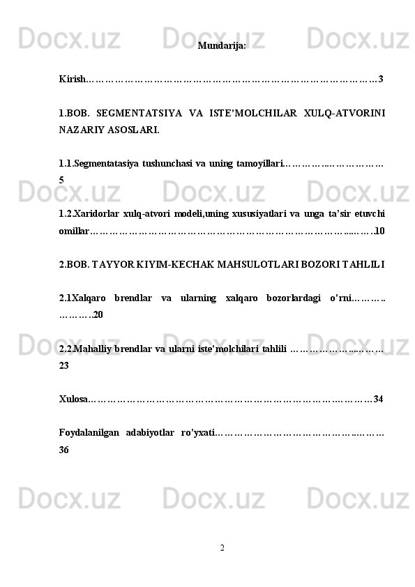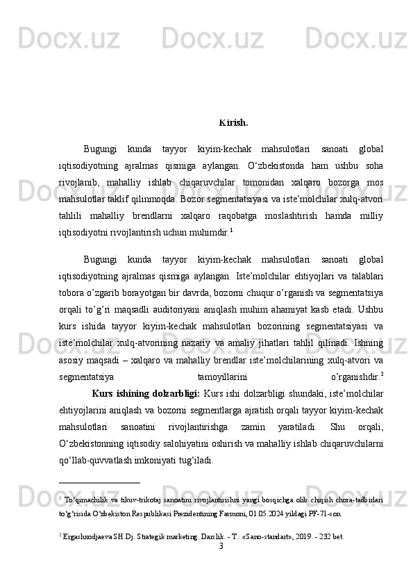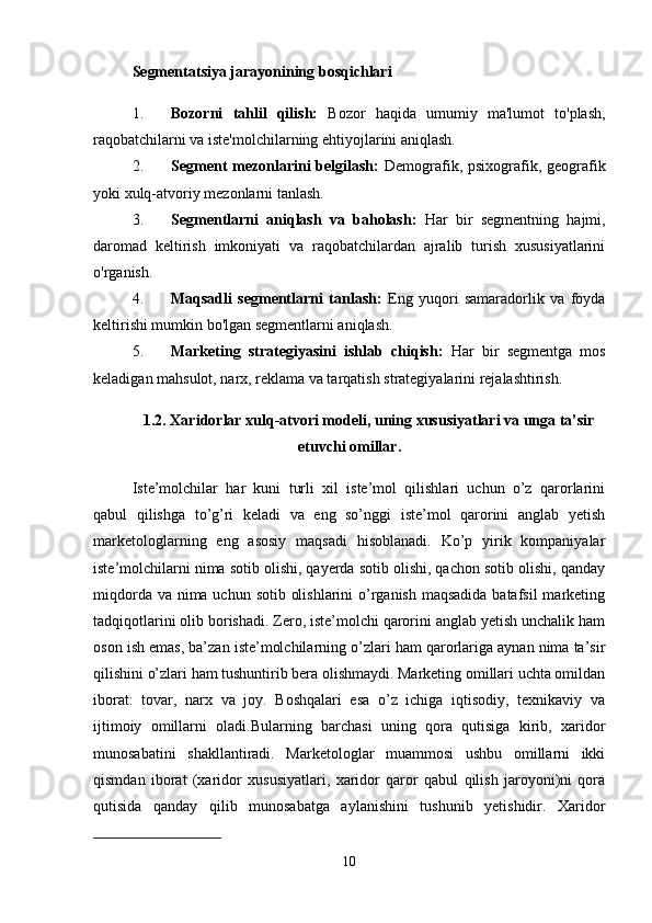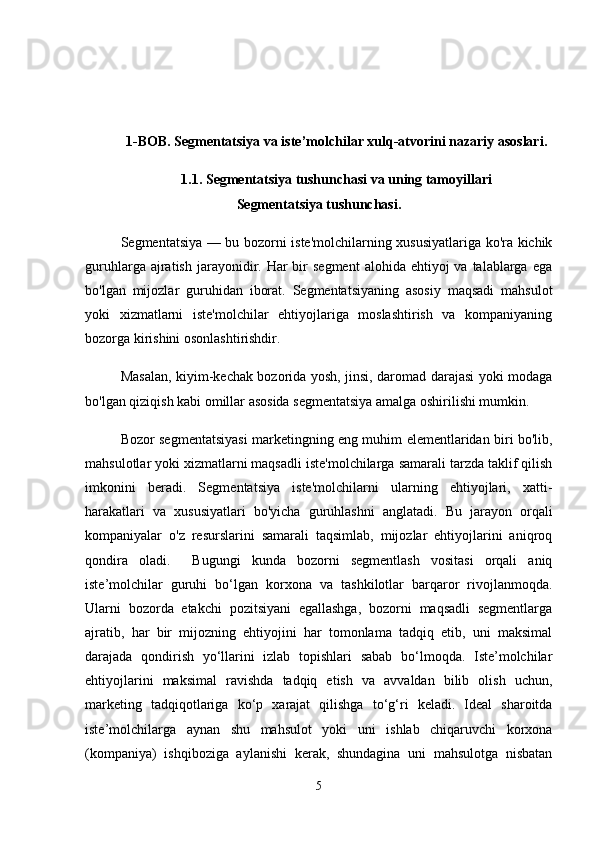 Tayyor kiyim-kechak mahsulotlari bozor segmentatsiyasi va iste’molchilar xulq-atvorini o’rganish