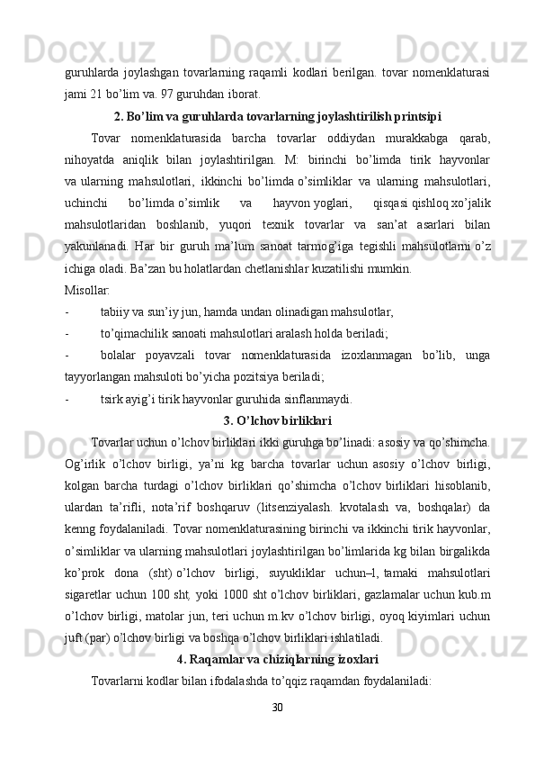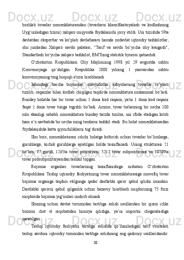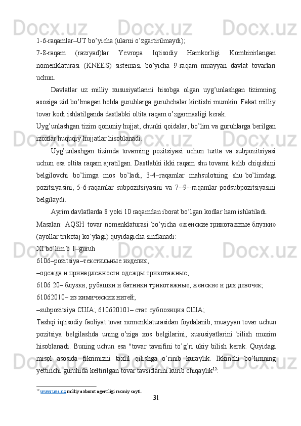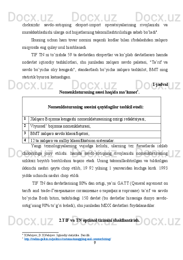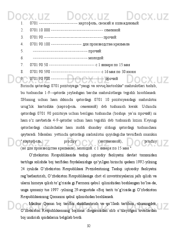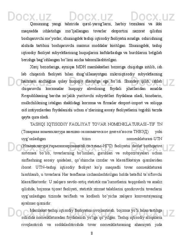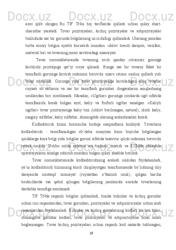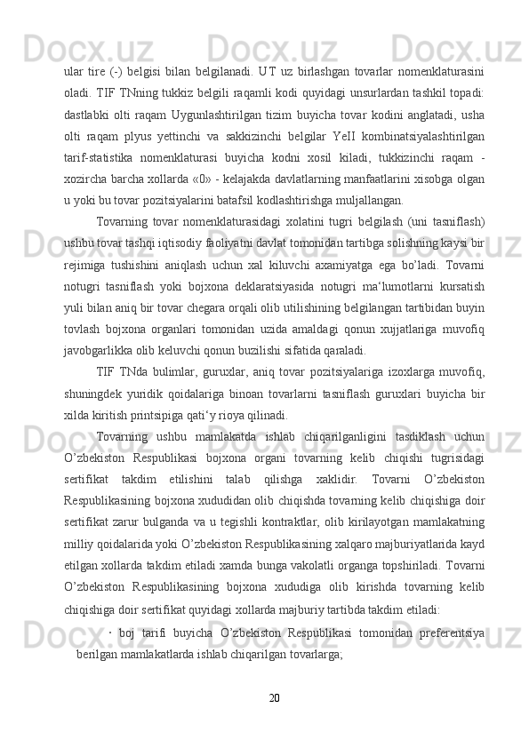 TIF TN boʼyicha alohida tovar guruhlarining bojxona nazoratini tashkil etish