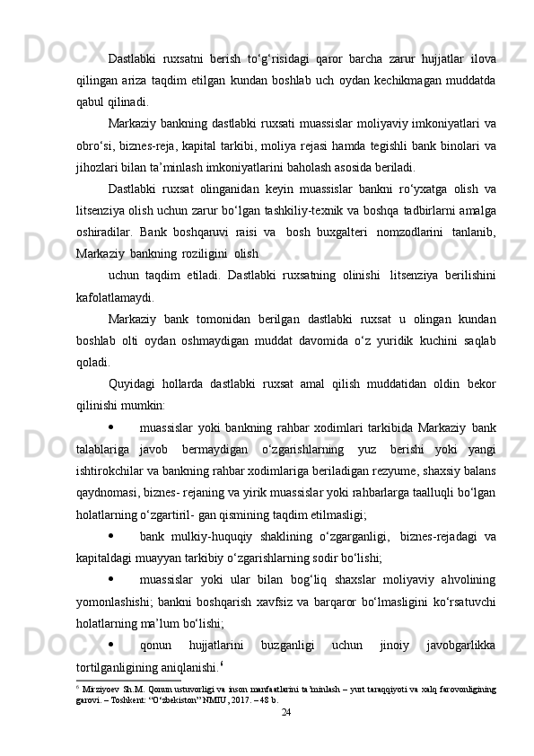 Markaziy   bank   tomonidan   berilgan   litsenziya   bankka   unda   ko‘rsatilgan