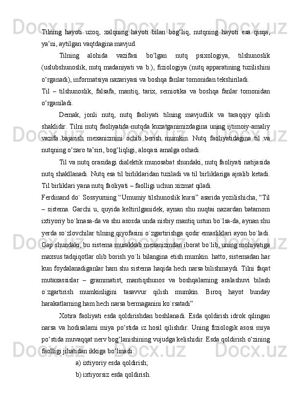 bеrilishi F.dе Sоssyur vа uning izdоshlаri yarаtgаn tа’limоt bilаn bоqliqdir. Til va