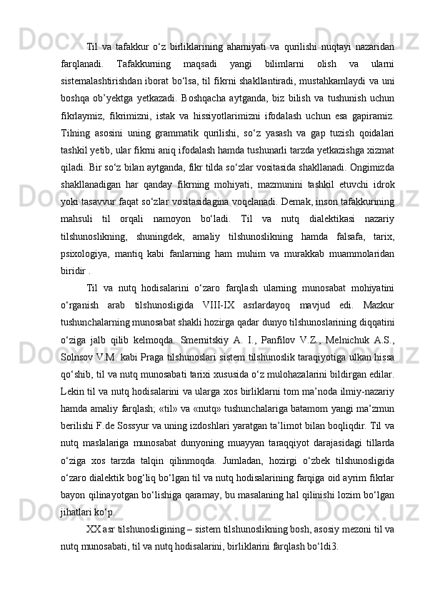 Sоlnsоv V.M. kаbi Prаgа tilshunоslаri sistеm tilshunоslik tаrаqiyotigа ulkаn hissа