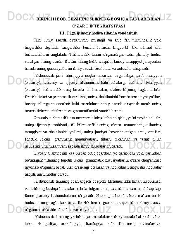 BIRINCHI BOB. TILSHUNOSLIKNING BOSHQA FANLAR BILAN O’ZARO INTEGRATSIYASI.....................................................................5