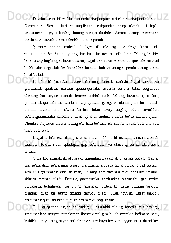 1.2. Tilning boshqa fanlar bilan aloqasi...........................…………………..9