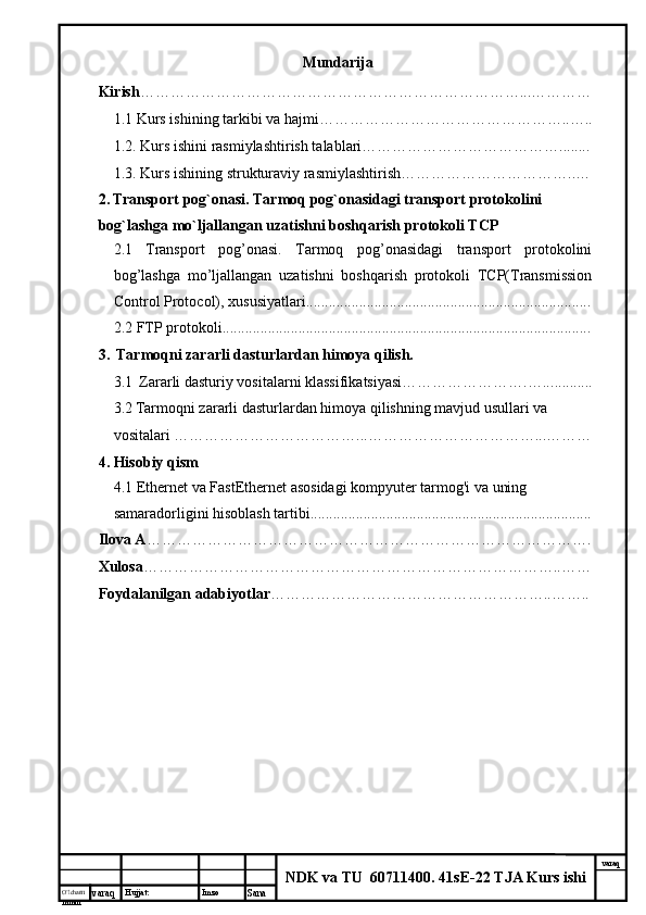 Transport pog'onasi. Tarmoq pog'onasidagi transport protokolini bog`lashga mo'ljallangan uzatishni boshqarish protokoli TCP, Tarmoqni zararli dasturlardan himoya qilish