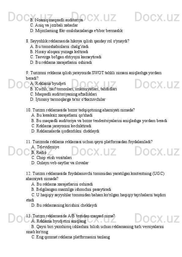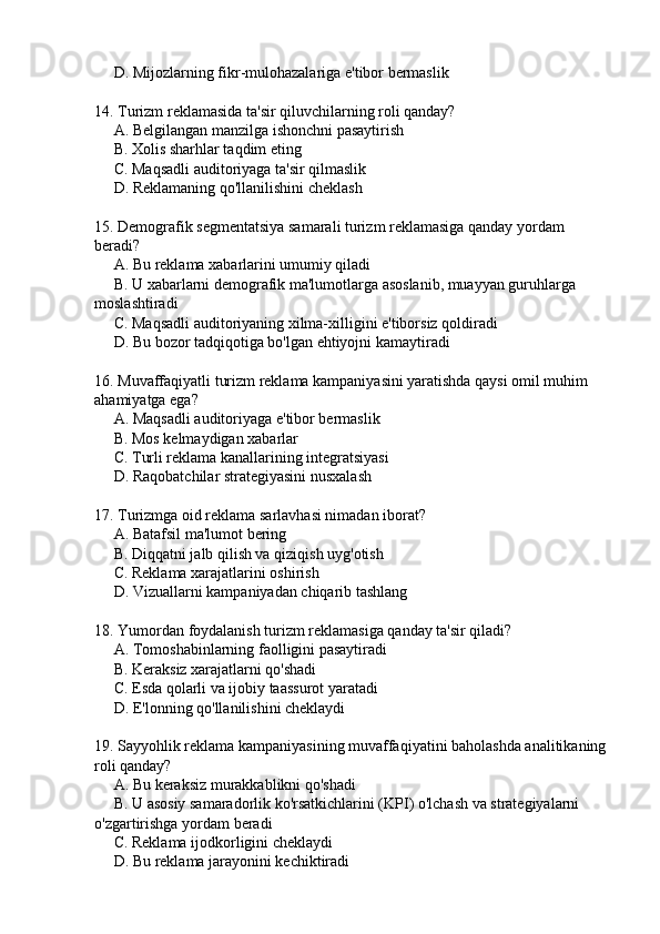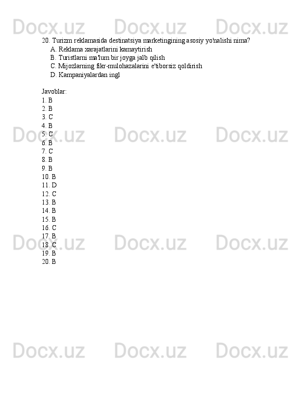 Turistik mahsulotlarni reklama qilish mavzusida 20 ta test