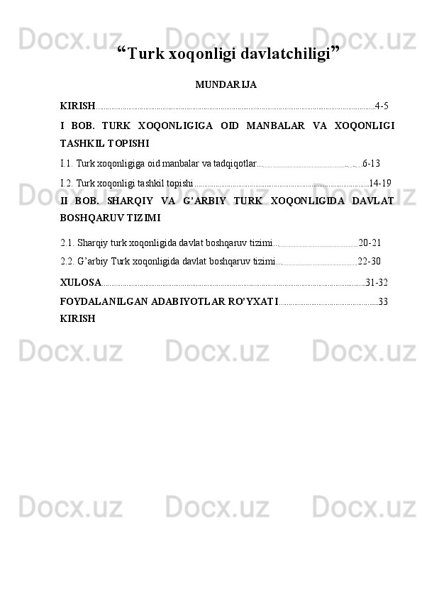 Kurs ishi predmeti:  Turk xoqonligi davlat boshqaruvi.