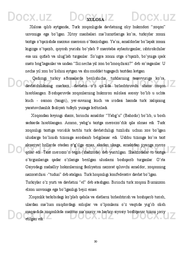 Xulosa   qilib   aytganda,   Turk   xoqonligida   davlatning   oliy   hukmdori   “xoqon”